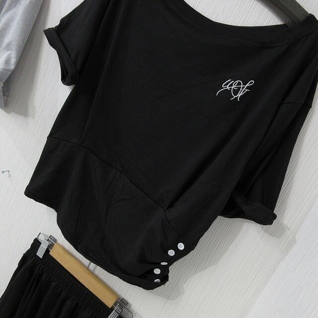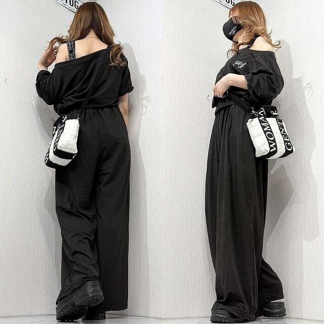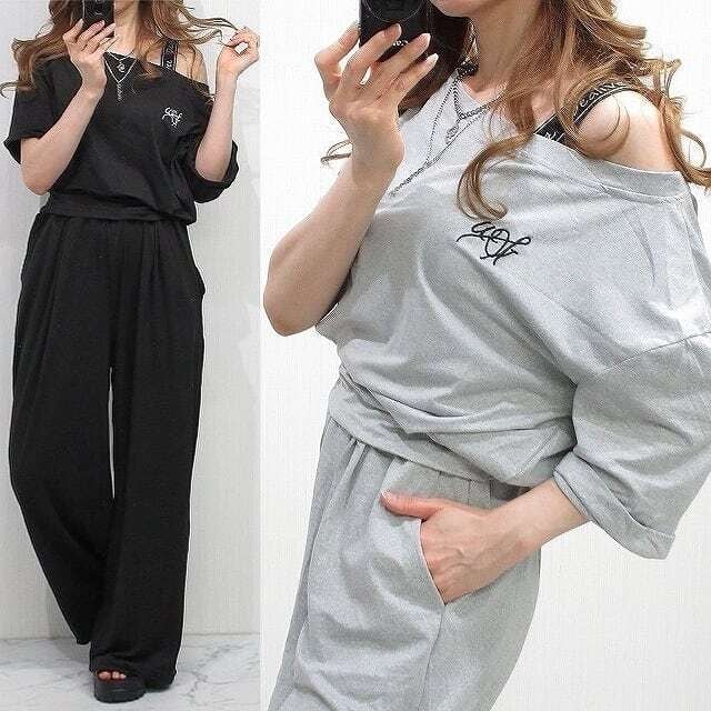 胸元刺繍 オフショル ゆるピタTops&ワイドパンツ 上下セットアップ