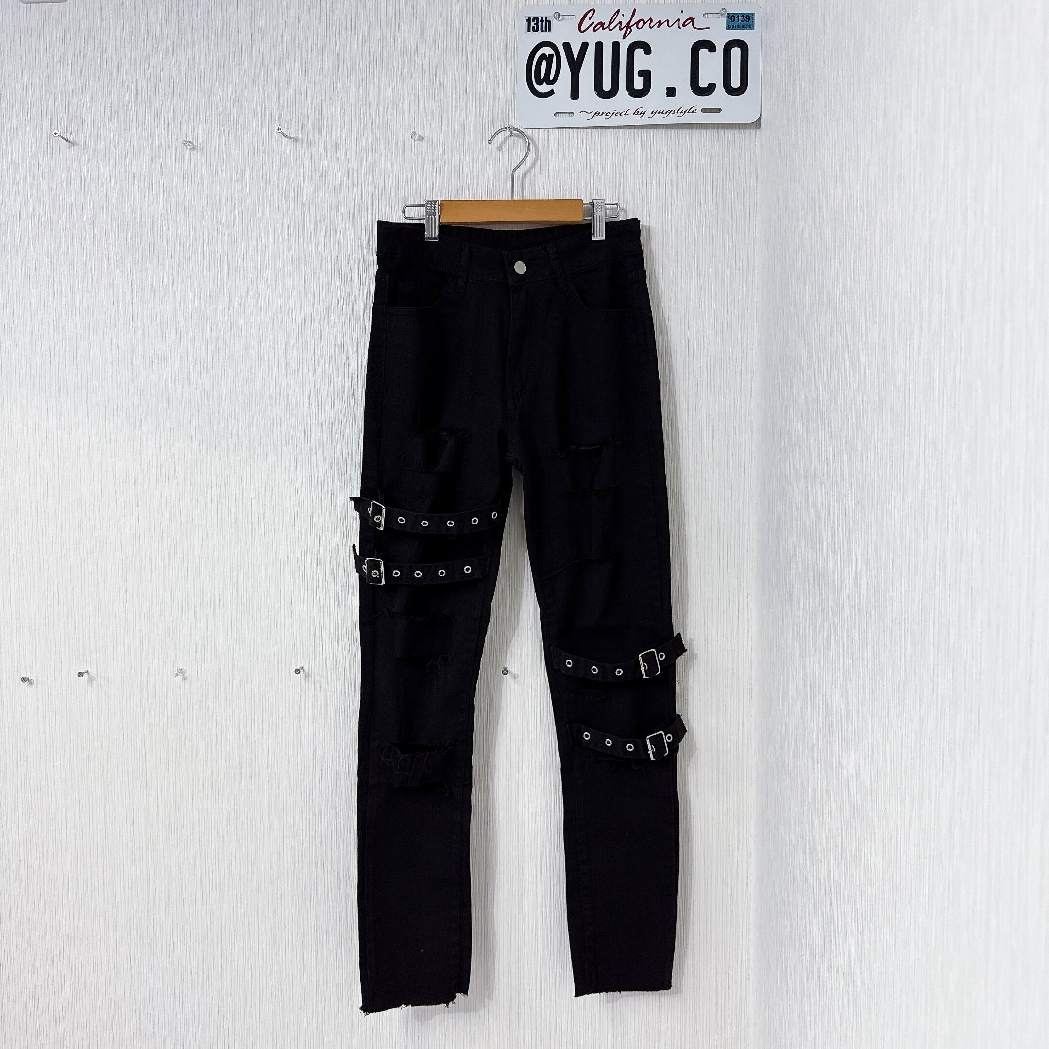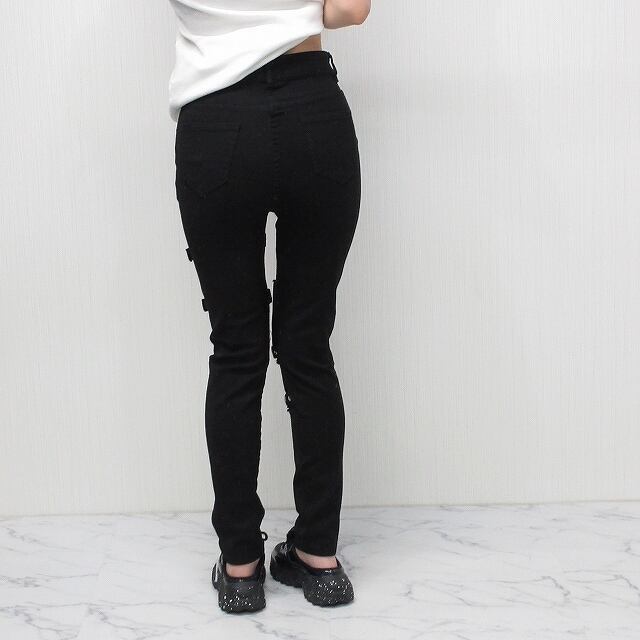 Wベルトデザイン 肌魅せ ダメージ 美脚脚長 ストレッチ デニムスキニーパンツ