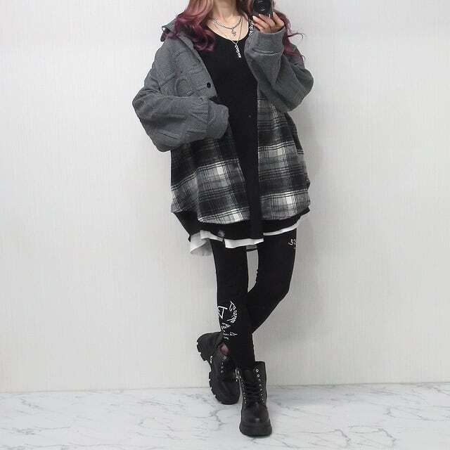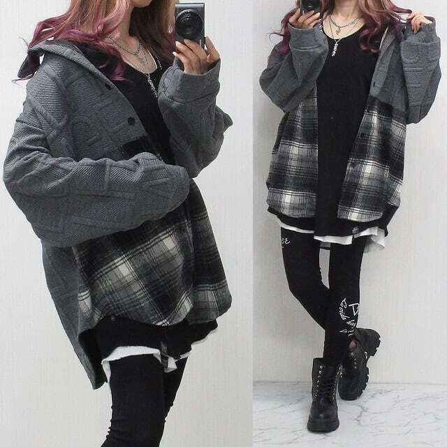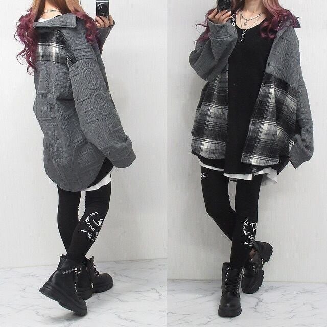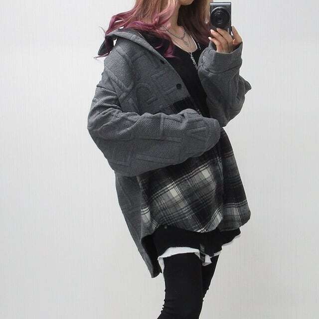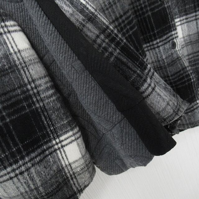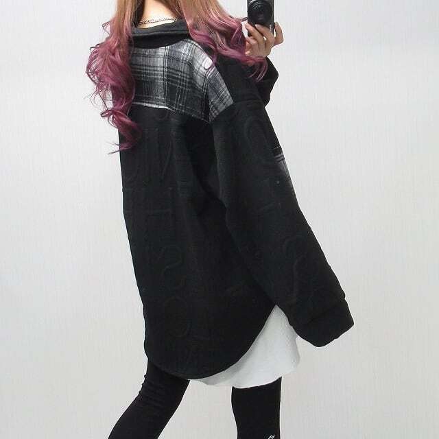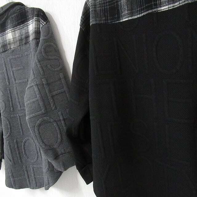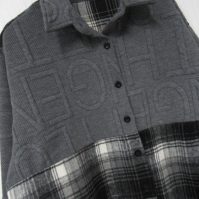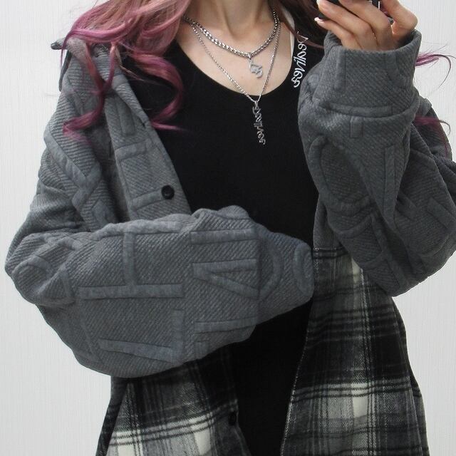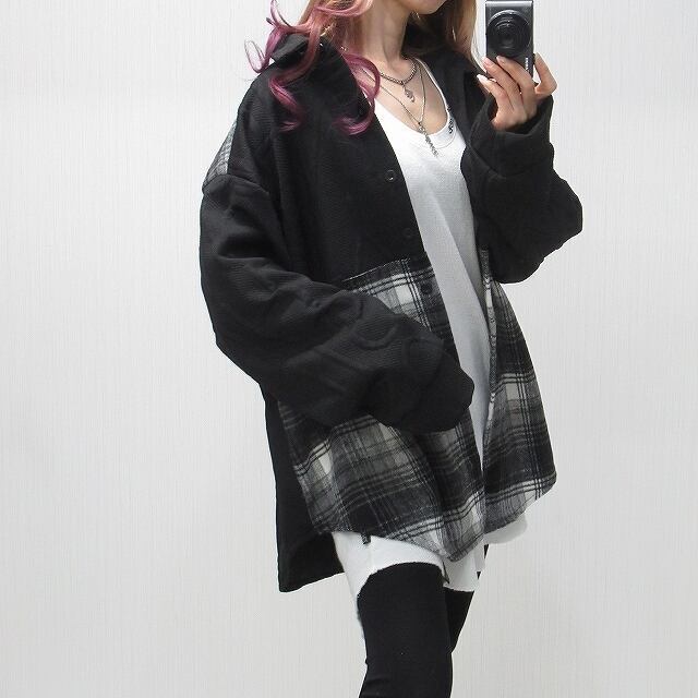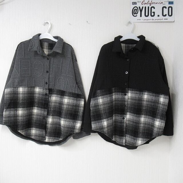 チェック柄 英字ロゴ エンボス 異素材MIX BIGシルエット オーバーシャツ